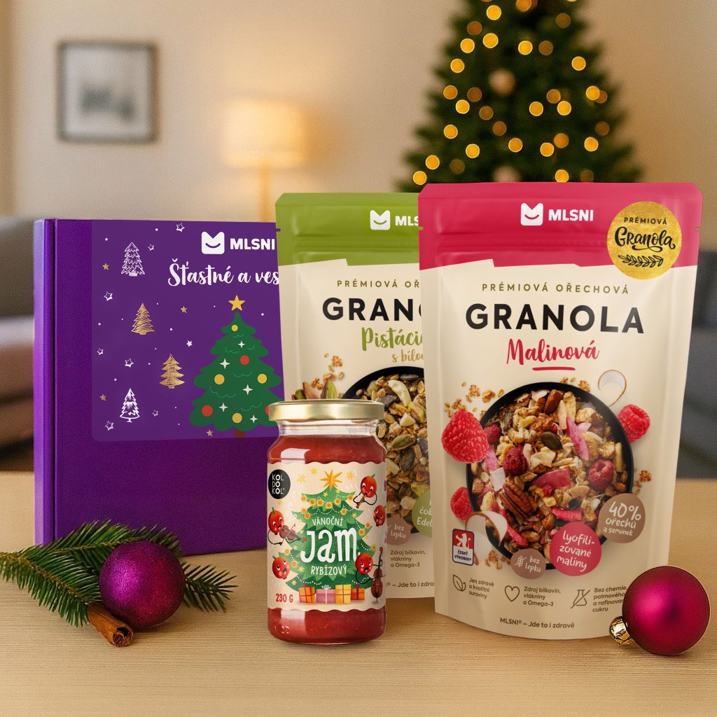 MLSNI Vánoční box Prémiové granoly Pistáciová s bílou čokoládou + Malinová + Vánoční JAM